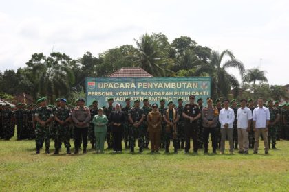 Pemerintah Kabupaten Lampung Timur bersama jajaran Forkopimda menyambut kedatangan personel Batalyon Infanteri Teritorial Pembangunan (Yonif TP) 943/Darah Putih Cakra dalam upacara penerimaan dan peny...