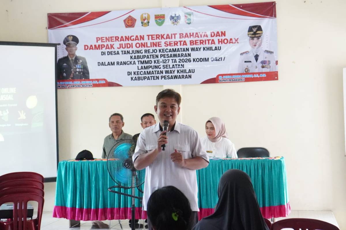 Dinas Komunikasi, Informatika, Statistik dan Persandian (Diskominfotiksan) Kabupaten Pesawaran turut ambil bagian dalam kegiatan nonfisik TNI Manunggal Membangun Desa (TMMD) ke-127 yang dilaksanakan oleh Kodim 0421/Lampung Selatan. Kegiatan berupa sosialisasi bahaya judi online dan penyebaran hoaks tersebut digelar di Balai Desa Tanjung Rejo, Kecamatan Way Khilau, Rabu (25/2/2026).
