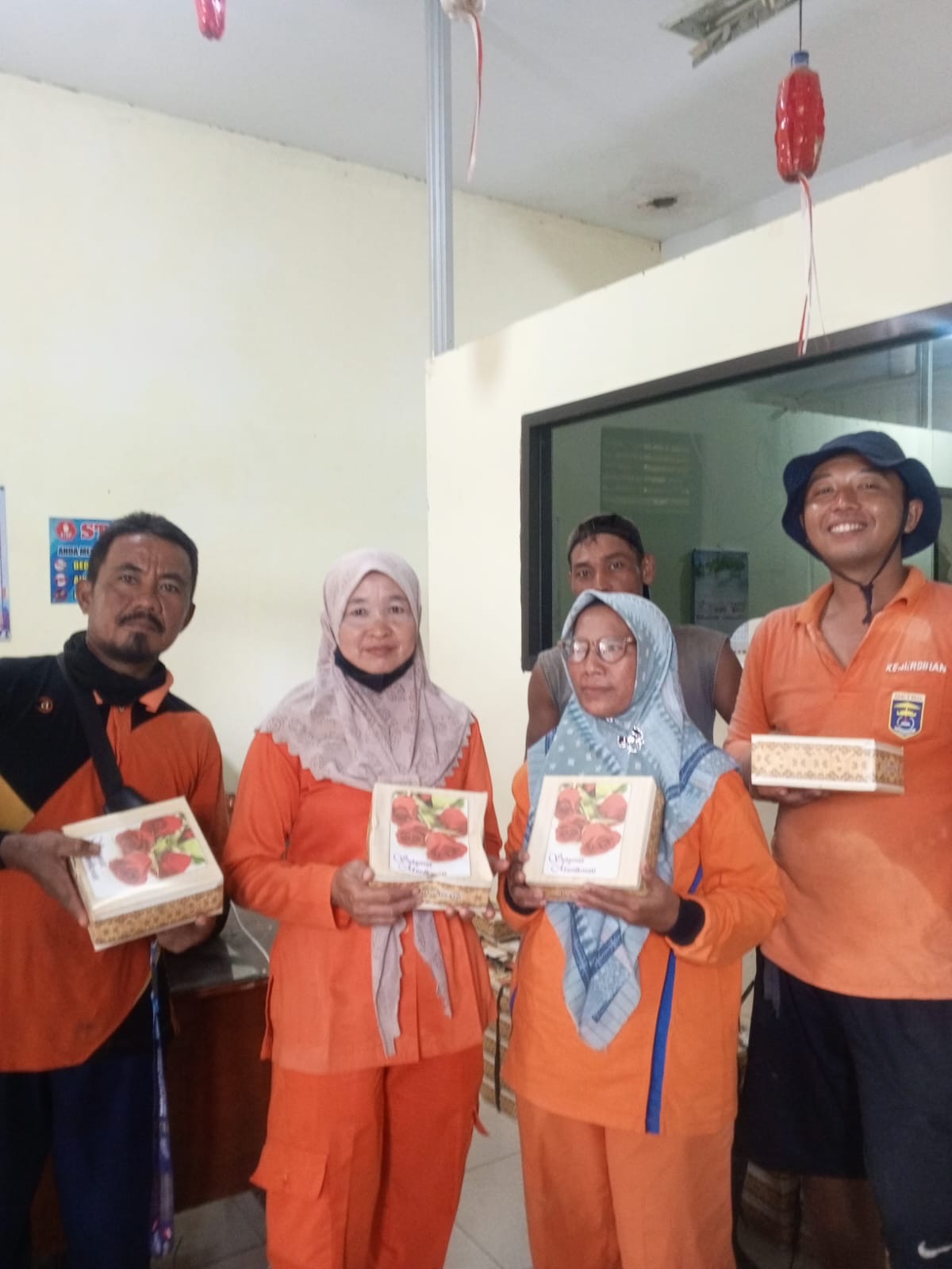 Pembagian nasi kotak ini mendapat sambutan positif dari para petugas kebersihan. Hal ini terpancar dari senyum sumringah para pasukan oranye saat menerima bantuan ini.